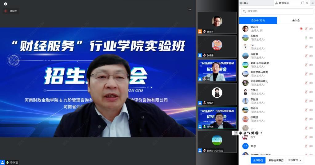 为深入实施产教协同育人,推动校企深度合作,全面提高人才培养质量,提升高校服务经济社会发展能力,2月2日下午,我校举办“财经服务”行业学院实验班线上招生宣讲会。校长李学志、九阶管理咨询有限公司总经理郭素玲出席会议,会计学院党政领导、科级以上干部、全体辅导员和2019级、2020级全体学生参加会议。