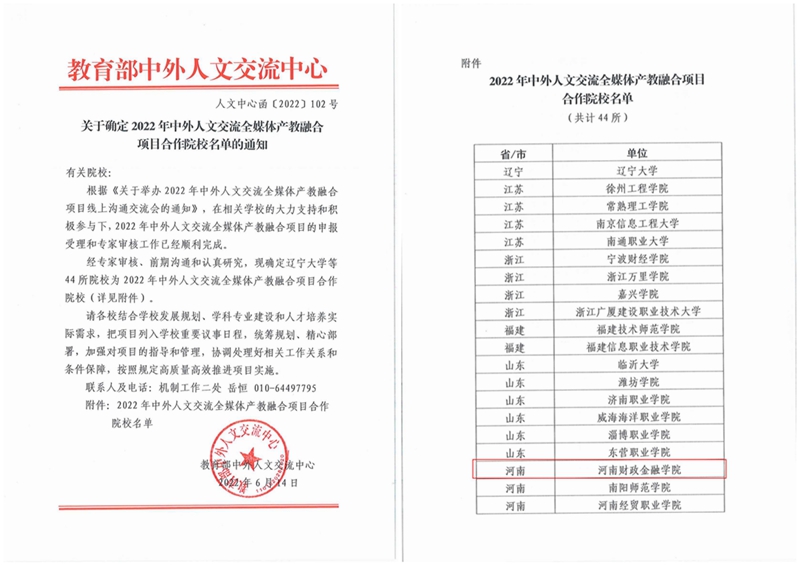 据悉,“中外人文交流全媒体产教融合基地”项目是由教育部中外人文交流中心与北京容艺教育咨询有限公司合作实施,旨在深入贯彻习近平总书记关于教育的重要论述和全国教育大会精神,落实《中办国办关于加强和改进中外人文交流工作的若干意见》《中办国办关于加快推进媒体深度融合发展的意见》《教育部等八部门关于加快和扩大新时代教育对外开放的意见》等文件要求,全面推动校企双方在数字文创领域的深度合作。全国共有44所高校入选2022年中外人文交流全媒体产教融合等项目首批合作院校名单。我校是河南省入选5所高校之一。