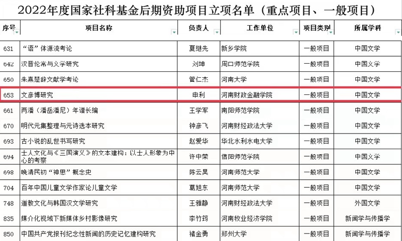 2月6日,全国哲学社会科学工作办公室公布2022年度国家社科基金后期资助暨优秀博士论文出版项目立项名单,我校申利博士主持的《文彦博研究》项目获得国家社科基金后期资助一般项目立项。(科研处 景琳婕/文 崔潮/审核)
