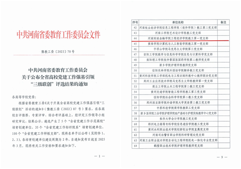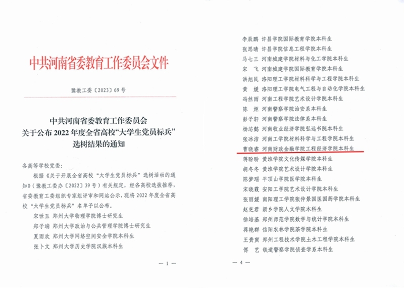 3月29日,全省高校组织工作会议在郑州召开,会议宣读了《中共河南省委教育工作委员会关于公布全省高校党建工作强基引领“三级联创”评选结果的通知》和《中共河南省委教育工作委员会关于公布2022年度“大学生党员标兵”选树结果的通知》,我校工程经济学院教工第一党支部获批“全省党建工作样板支部”,工程经济学院本科生党员曹晓睿荣获全省高校“大学生党员标兵”荣誉称号。