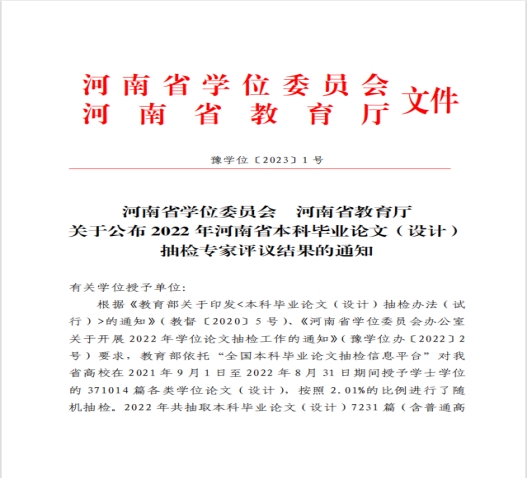 近日,河南省学位委员会、河南省教育厅下发了《关于公布2022年河南省本科毕业论文(设计)抽检专家评议结果的通知》(豫学位〔2023〕1号)文件,公布了本科毕业论文(设计)抽检专家评议结果。我校被抽检本科毕业论文(设计)评议结果为全部合格,无“存在问题毕业论文”和“高校未上传论文”,合格率达100%。
