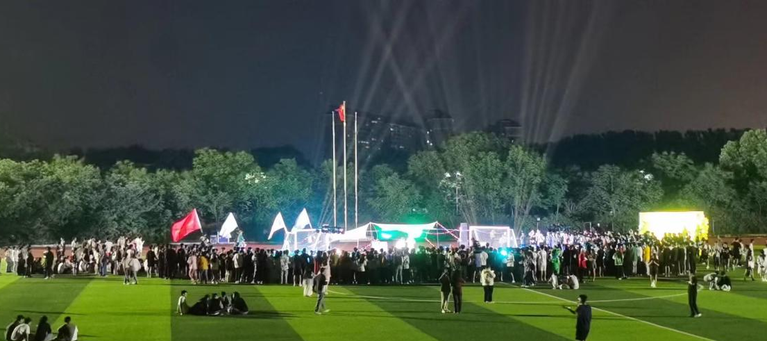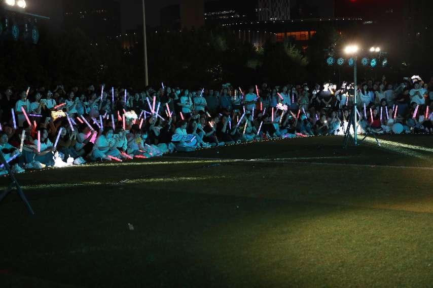 晚上七点半,星光闪烁的夜空下,活力四射的街舞表演拉开草地音乐节的序幕,流行音乐、街舞、服装秀等节目以多种音乐形式精彩呈现,观众们热情似火、跟随律动,氛围感瞬间拉满。《阳光宅男》《当你》《一万次悲伤》《茉莉花开》……一首首流行歌曲、青春歌舞的演绎,表达着永利学子昂扬的人生态度和坚定的人生追求。同学们打开手机闪光灯,尽情挥舞,彩色的荧光棒与舞台灯光交相辉映,灯光和音乐交相辉映,汇聚成光的海洋。