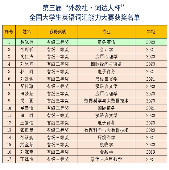 在第三届“外教社·词达人杯”全国大学生英语词汇能力大赛省级复赛中,我校共有17名同学获奖,其中会计学院2021级会计学专业学生孙可昕同学、教育科学学院2020级应用心理学专业学生尚仁杰同学获得省级一等奖,外国语学院2020级商务英语本科一班学生聂晓楠等15名同学获得省级三等奖。