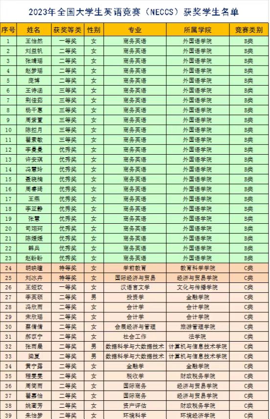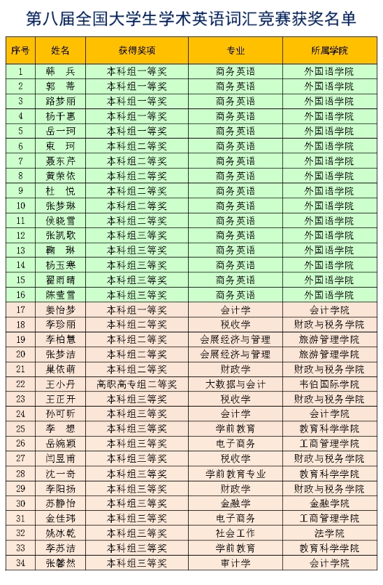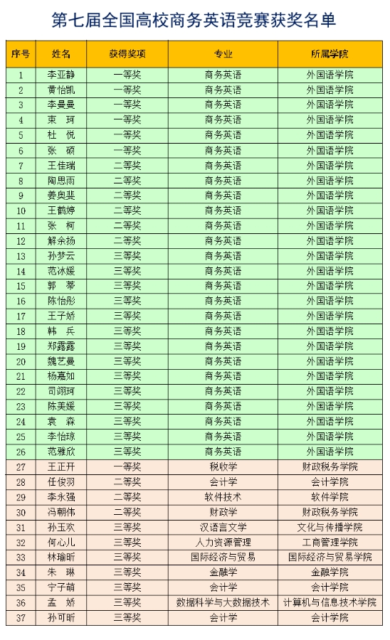 在第七届全国高校商务英语竞赛中,我校学子共有37名同学获奖,其中李亚静等7人获一等奖,王佳瑞等9人获二等奖,孙梦云等21人获三等奖。