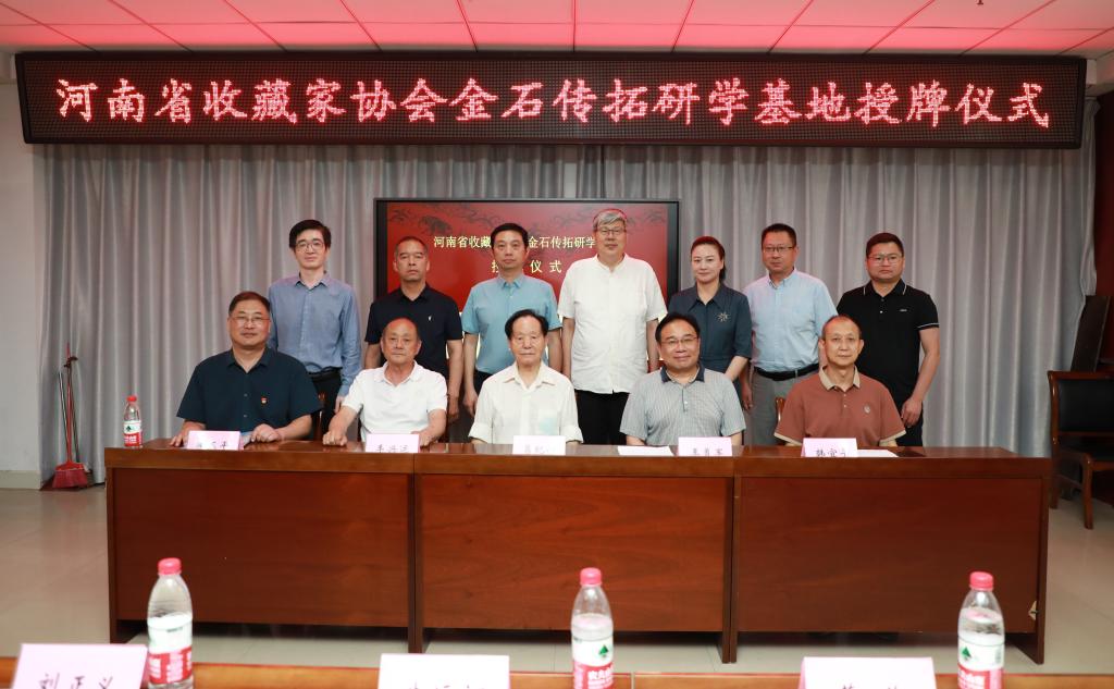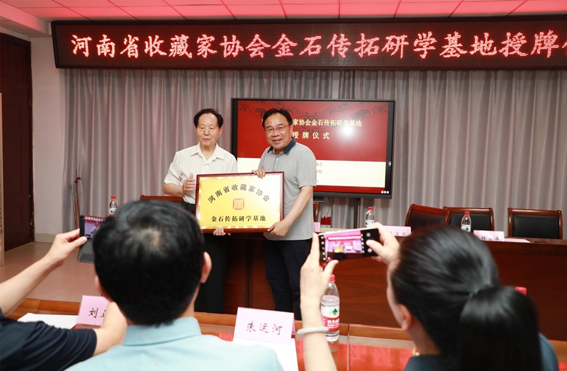 近日,河南省收藏家协会金石传拓研学基地在文化与传播学院汉画小馆揭牌。校党委副书记、工会主席王勇军出席授牌仪式并致辞。河南省收藏家协会终身名誉会长葛纪谦、协会会长丰兴运及河南省收藏家协会、文化与传播学院(非物质文化遗产研究基地)相关负责同志出席开幕式。