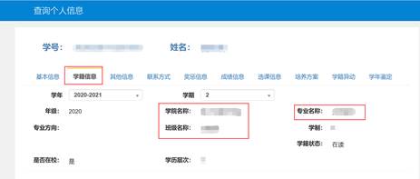 2.在“查询个人信息”窗口,点击“学籍信息”选项卡。选中“2020-2021学年第2学期”,在页面上查询学院名称、专业名称和班级名称是否有误。如有误,请于4月1日(周四)下午17:00之前到学生处学籍科(龙子湖校区知行楼111室)解决。