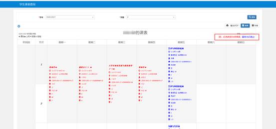 2.在“学生课表查询”页面,可查询到学生的个人课表,红色和蓝色字体均为本学期已选上须修的课程。