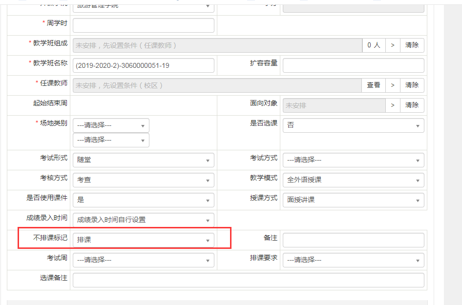 (六)在安排教学任务时,教务管理系统默认集中实践课程的不排课标记为“不排课”,其余课程的不排课标记为“排课”。所以各学院不需要操作此数据。