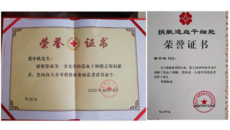 黄中秋同学于2019年8月加入了中国造血干细胞捐献者资料库。今年4月,经中华骨髓库检索,他与一位血液病患者HLA(人类白细胞表面抗原)分型相合,经过全面体检,完全符合捐献造血干细胞条件。在河南省红十字会的协助下,他毫不犹豫地兑现了自己的承诺,向素昧平生的患者捐献了自己的造血干细胞,挽救了患者的生命。